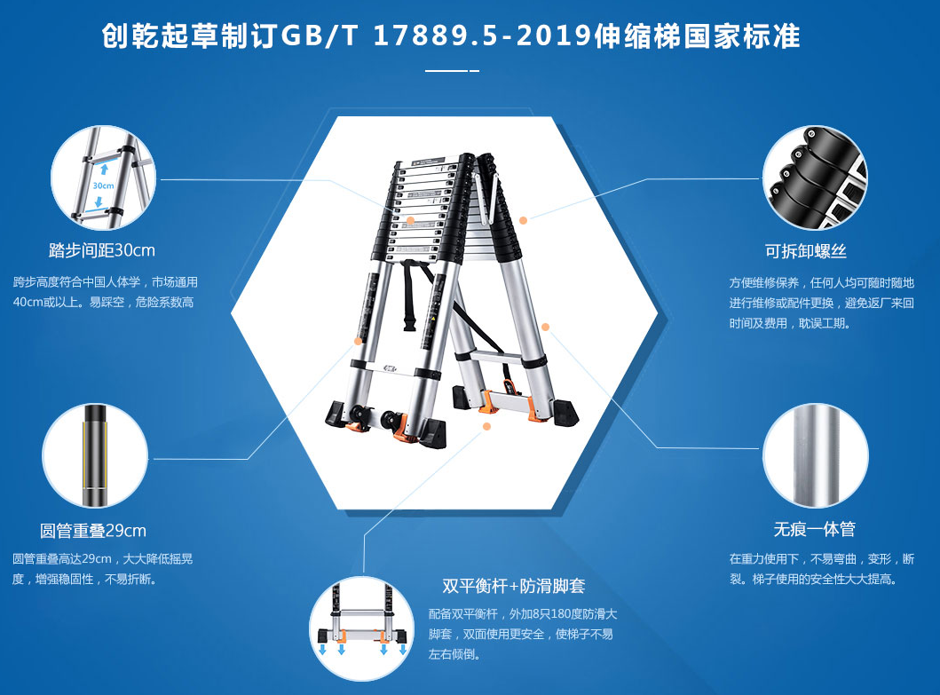 廣東創(chuàng)乾梯具有限公司歡迎您,主營:伸縮梯子,折疊梯子,鋁合金梯子,人字梯子,安全梯,竹節(jié)伸縮梯等產品!