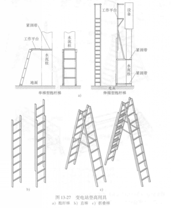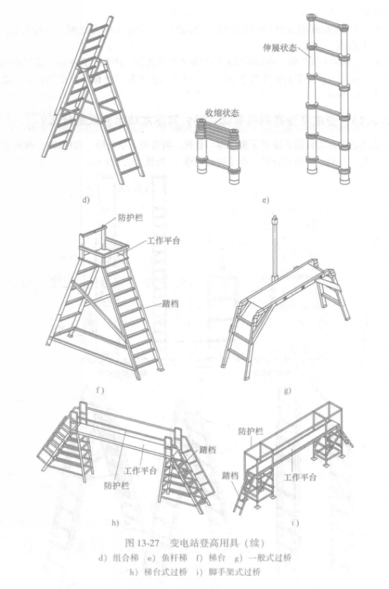 變電站登高用具包括梯子(抱桿梯、直梯、折疊梯、組合梯、魚桿梯)、梯臺和過橋,腳手架式過橋)