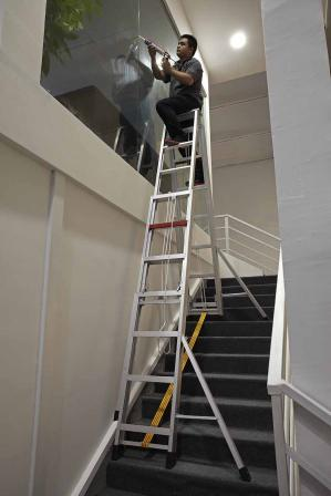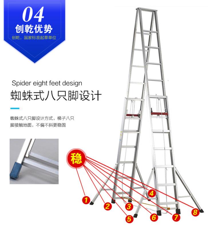 科技是第一生產(chǎn)力,毫無疑問,一款新穎的升降梯就是這樣誕生的,這款高空升降梯子屬于重型工程梯,長度4米到12米,雙面伸縮梯有八只腳,其中有四只是活動(dòng)腳(在空間窄的地方也能使用),當(dāng)腳撐開時(shí),能夠獨(dú)立使用,無需依靠物,繩子手拉式伸縮方便快捷。